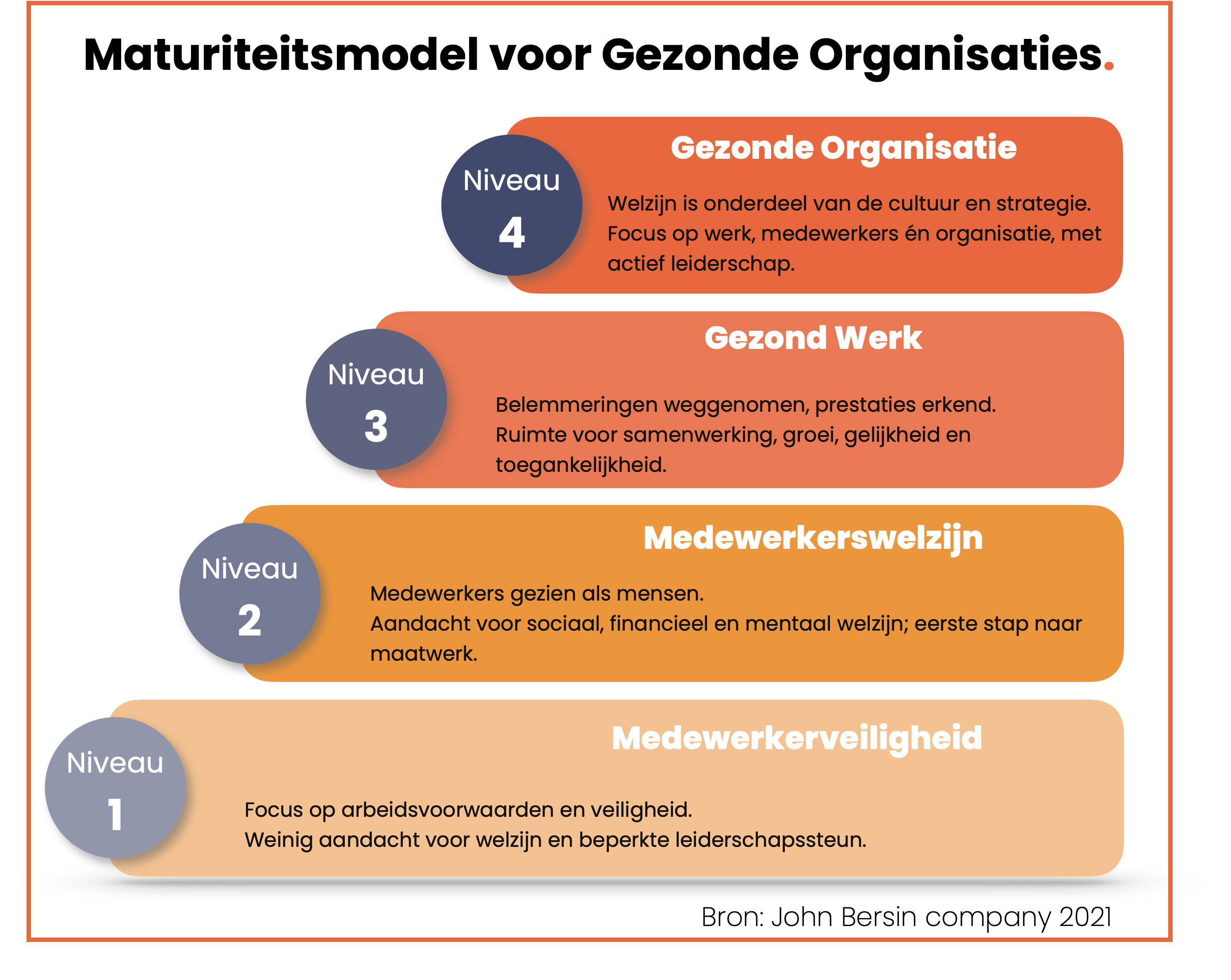 Onderzoek van Josh Bersin biedt een heldere lens op dit vraagstuk. Het laat zien dat toekomstbestendige organisaties verder kijken dan alleen welzijn of productiviteit. In zijn model The Healthy Organization onderscheidt hij vier niveaus van volwassenheid: