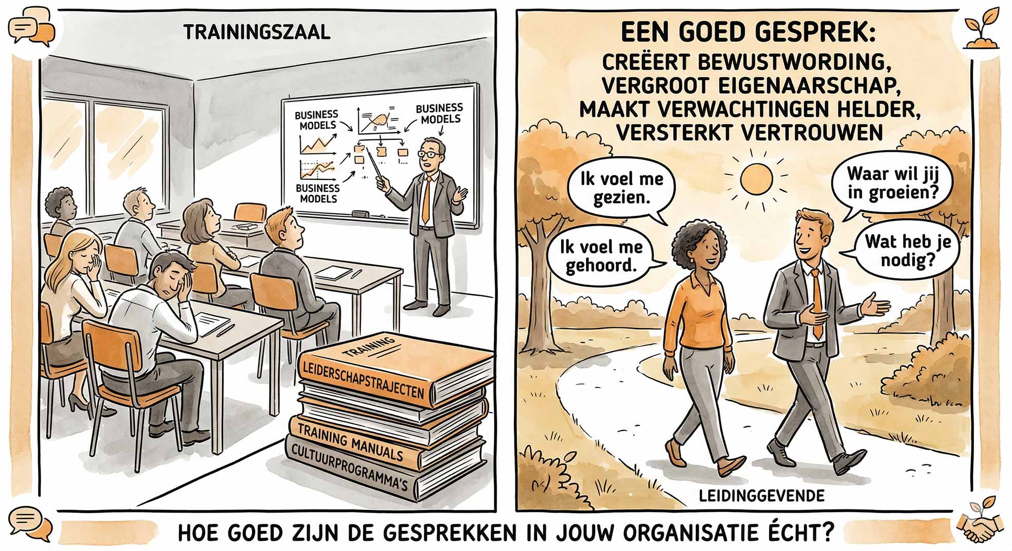 Veel organisaties denken groots als het gaat om ontwikkeling. Grote programma’s. Externe sprekers. Cultuurtrajecten. Maar cultuur wordt niet gebouwd in events. Cultuur wordt gevormd in terugkerende gesprekken tussen leidinggevende en medewerker.